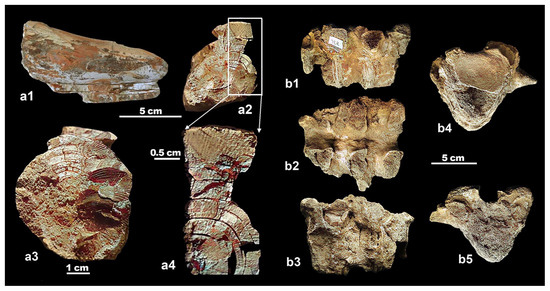 Mammuthus lamarmorai from Guardia Pisano Hill (Gonnesa) (Museo dei Paleoambienti Sulcitani—“E.A. Martel” of Carbonia); large fragment of tusk in lateral view (a1); distal (a2) and proximal (a3) natural transversal sections; particular of the distal natural section where the Schreger lines and angles are clearly visible (a4). Mammoth remains found at “Cuccu de Cori”, at least according to [21] (Museo Sardo di Geologia e Paleontologia “D. Lovisato” of Cagliari); largely incomplete thoracic vertebrae in lateral (b1,b3), dorsal (b2), cranial, and caudal (b4,b5) view.