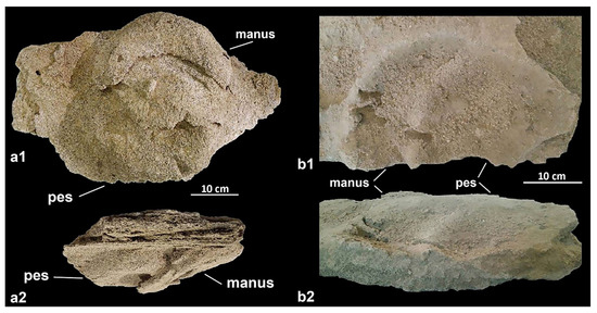 Proboscipeda panfamilia footprints from Funtana Morimenta spring (Gonnesa); manus-pes hyporelief in inferior (a1) and lateral (a2) view; incomplete epirelief of the manus-pes couple in superior (b1) and lateral (b2) view (modified from [45]).