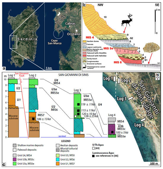 San Giovanni di Sinis. (a) Location of the outcrops of the San Giovanni di Sinis area. (b) Stratigraphic sketch from which the Mammuthus lamarmorai molar was retrieved. 1: calcrete; 2: palaeosol developed on beach sediments rich in Helicidae remains; 3: conglomerate containing pebbles from the erosion of the underlying level as well as basalt pebbles; 4: beach sediments; 5: palaesols with rhizoliths; 6: marine deposits rich in Mytilidae and Ostreidae shells (MIS 5e); 7: lagoonal deposits with mollusks; 8: calcrete; 9: beach deposits overlying a conglomerate with remains of Ostrea shells; 10: dunes; asterisk: mammoth molar; the arrow indicates the coastal marsh deposit with Praemegaceros cazioti remains; S1 and S2 erosional surfaces (modified from [40]). (c) Stratigraphic logs measured along the San Giovanni di Sinis coast close to the stratigraphic sequence. The bold line indicates the unconformities bounding the units (modified from [63,66]).