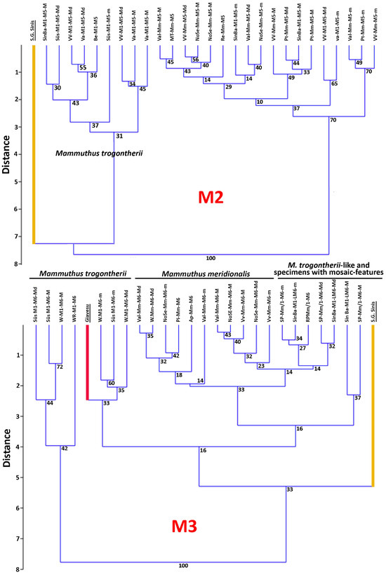 For the purpose of obtaining some clues, we carried out a similarity analysis of the data reported in Table 2, using as variables the M2 and M3 measurements (Figure 7). In the dendrogram obtained for M2, two clusters are present. One gathers mostly M. trogontherii specimens; the other includes M. meridionalis, M. trogontherii-like, and a couple of M. trogontherii molars. The SGS molar is set as a separate ramus of the M. trogontherii cluster. In the dendrogram obtained for M3, the separation between M. meridionalis and M. trogontherii is less clear. SGS still falls in a separate ramus, but in a large cluster that includes two subclusters: a smaller one with some steppe mammoths and the CG molar, and a larger one with M. meridionalis, M. trogontherii-like, and specimens showing a mosaic of advanced and primitive characteristics. Therefore, the results of the analysis prevent us from asserting with absolute certainty whether the SGS tooth is an ultimate (M3) or a penultimate molar (M2). However, considering the molar size reduction, the maximum crown width is proportionally more similar to that of M3 than that of M2 (Table 2), which could lean towards an assignment to M3.