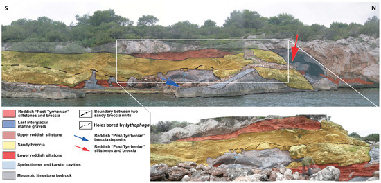 Panoramic view of the deposits exposed at “Punta del Quadro”, not far from Tramariglio Tower (modified from [61] according to Palombo and Ibba’s unpublished data).