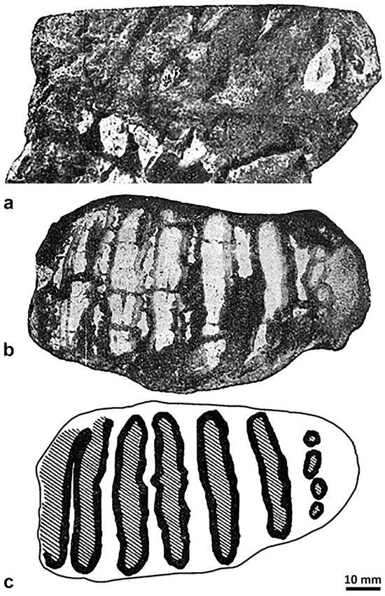Mammuthus cf. M. lamarmorai from the Tramariglio area (Porto Conte Bay, Alghero, SS): molar in labial (a) and occlusal (b) view; schematic drawing of the occlusal surface (c) (modified from [37]).