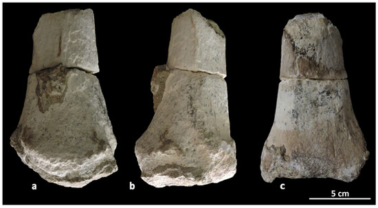 Mammuthus cf. M. lamarmorai from Alghero: distal part of the left tibia in lateral (a), anterior (b), and posterior (c) views (modified from [12]).