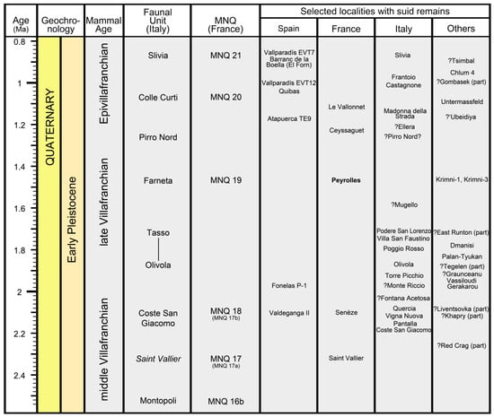 In general, until now, accepting or not the absence of suids from Europe in the 1.8–1.2 Ma time span rested on the biochronological placement of some localities (e.g., Ceyssaguet, Ellera, Mugello), which is prone to subjectivity and biased by the paucity of late Villafranchian deposits in several areas (see next section), and on discounting or not occurrences merely based on faunal lists (especially Peyrolles and Pirro Nord).