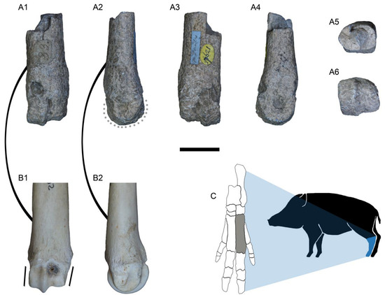 (A) The fragmentary left fourth metatarsal of Sus sp. from Peyrolles (NHMUK PV OR 27621) in anterior (A1), internal (A2), posterior (A3), external (A4), proximal (A5), and distal (A6) views; (B) the homologous element of Sus scrofa for comparison, in anterior (B1) and internal (B2) views; (C) anatomical sketch indicating the position of the bone. The dotted line in A2 approximately indicates the missing portion of the trochlea. The scale bar corresponds to 20 mm.