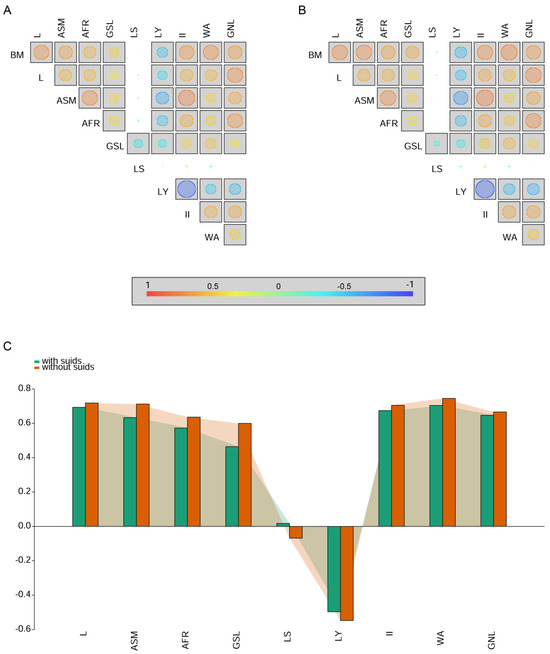 Correlation plot of variables related to reproduction in artiodactyls, with (A) or without (B) the inclusion of suids; (C) Correlation between BM and other variables. Boxed areas indicate significant results (at α = 0.05).