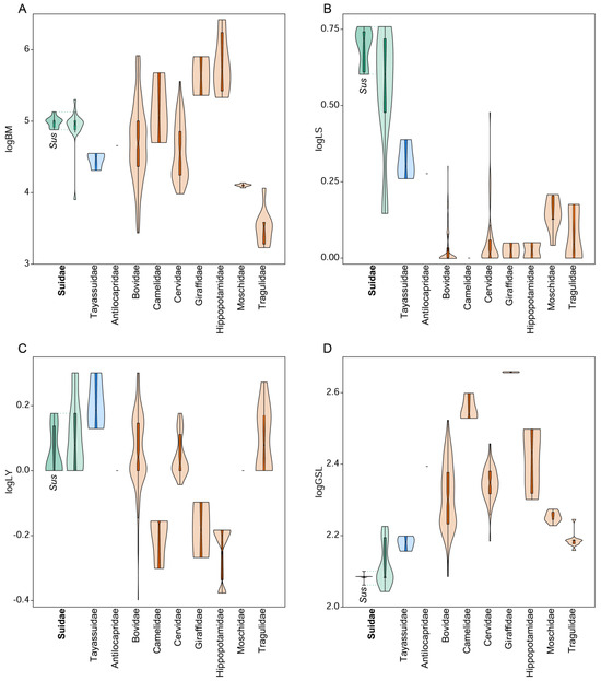 BM (as a proxy for most other reproduction-related variables), LS, LY, and GSL are considered in further detail given the aforementioned results. Violin and box plots are used to visualize these variables in different families of artiodactyls and separately for Sus (Figure 6).
