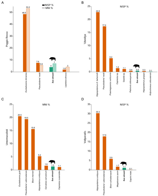 Abundance of suids (in green) and other artiodactyls (in orange) in terms of number of identified specimens (NISP) or minimum number of individuals (MNI) at: (A) Poggio Rosso [49]; (B) ‘Ubeidiya layer II-23 [50]; (C) Untermassfeld [51]; (D) Vallparadís layer EVT7 [52]. Percentages refer to all large mammals but only artiodactyls are plotted.