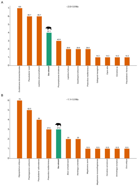 Frequency of occurrence of suids (in green) and other artiodactyl species (in orange) in southwestern Europe ~2.0–1.8 Ma (A) and ~1.1–1.0 Ma (B). The vertical axis indicates the number of localities. The value above each bar represents the percentage of occurrence over the total of localities. Data are from Palombo [3], with emendations detailed in Section 3.3.