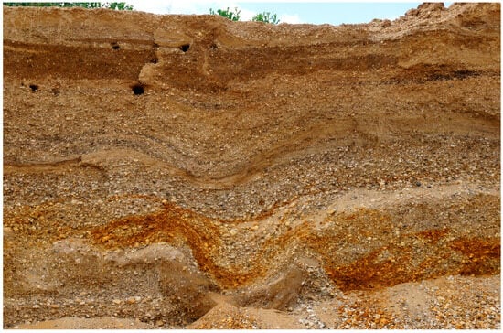Favorable conditions for the development of well-developed marshy flood basins with anabranching or anastomosing systems occurred in the past, for instance, during snow-rich periods in the Pleistocene tundra of north and central Europe, with long seasonal frost [44,45]. They look similar to the modern Subarctic wetland systems by their avulsions and adjacent shallow lakes for much of the year. Sandy bars and channel fills alternate with crevasse splays, while gyttja and organic and sandy-silty beds of reworked loess fill the marshy backswamps (e.g., [33,46,47]). Inactive subaerial beds were frozen and disturbed by a range of cryogenic structures, including ice-wedge and frost fissure polygons, while in phases of re-activation, the thawed subsoil was prone to cryoturbation (e.g., [31,33,45,47,48]).