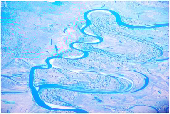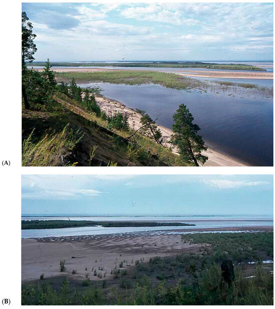 In some regions, braiding could be hindered by limited availability of sediment load or by locally reduced runoff due to low amounts of winter snowfall or densely vegetated land surface [37]. Under such conditions, a braided pattern is only present at the beginning of breakup when discharges are highest, and vegetation is not well-developed. The braided pattern may be substituted by a multi-channel anabranching system with stable islands and individual channels where tundra or taiga vegetation restricts sediment supply [1]. Typical examples may be mentioned from the Holocene Usa River in north Siberia [38] and the modern lower/middle Lena River in east Siberia [39] (Figure 4).
