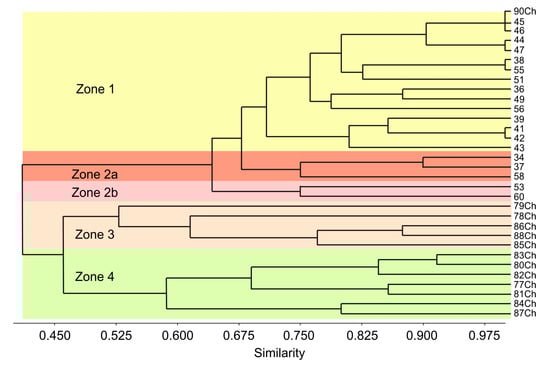 The results of cluster analysis applied to the percentages of living ostracod database in the studied area. Bands of different color marks stations belonging to different zones: Zone 1 (yellow), Zone 2a (brown), Zone 2b (rose), Zone 3 (orange), Zone 4 (green).