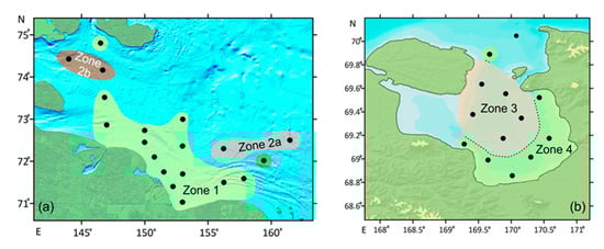 Zones 1 and 2 are located in the western part of the ESS near the Indigirka River mouth at different distances from the river discharge area while Zones 3 and 4 are within the Chaun Bay (Figure 3).