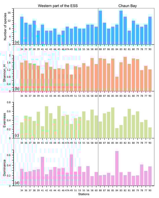 Ostracod distribution on the studied stations: (a)—number of species; (b)—Shannon diversity index; (c)—evenness index; (d)—dominance index.