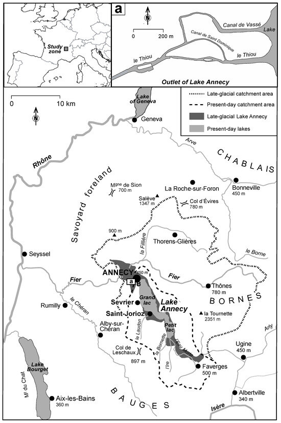 - Nicoud, G.; Manalt, F. The lacustrine depression at Annecy (France), geological setting and Quaternary evolution. J. Paleolim. 2001, 25, 137–147. [Google Scholar] [CrossRef]