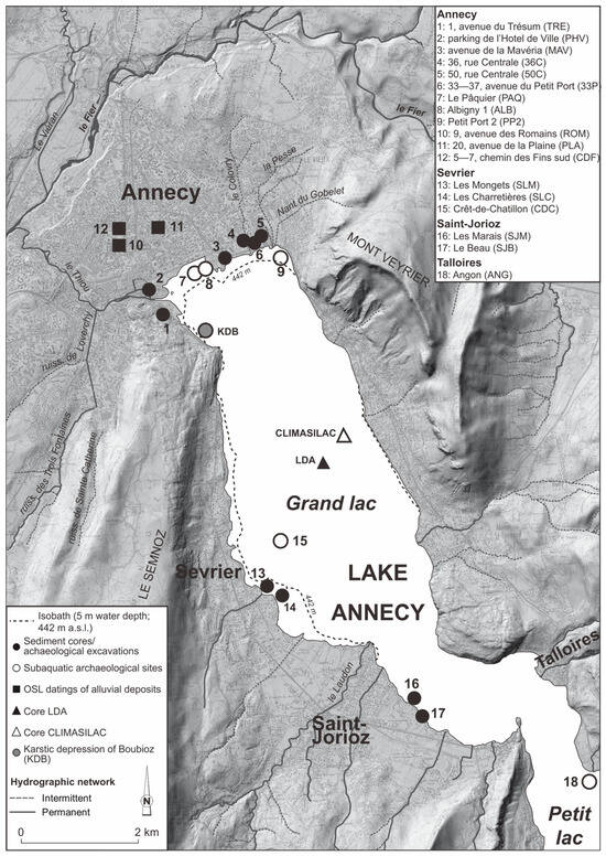- Vérot, A.; Magny, M.; Morin, E.; Brigand, R.; Richard, H.; Marguet, A.; Gabayet, F.; Hinschberger, F.; Mevel, L. Paléoenvironnement et Archéologie de la Rive nord du lac d’Annecy à Annecy et Annecy-le-Vieux (Haute-Savoie); Rapport de synthèse du PCR 2016–2020; DRAC Auvergne-Rhône-Alpes: Lyon, France, 2021; Volume 2, 440p. [Google Scholar]