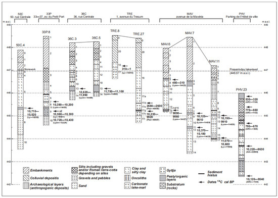 The sediment profile of Sevrier Les Mongets revealed three successive phases of higher lake levels (phases 2, 4, and 6). The last appears to be the highest and is also evidenced by the deposition of carbonate lake marl in Annecy-Maveria (layers 11–10) and 33–37 Avenue du Petit Port (layers 8–6). The peaty layers observed on the sites of Annecy-Trésum (layers 27–17 g), 33–37 Avenue du Petit Port (layers 8–9), 50 Rue Centrale (layers 4–11), and Avenue de la Mavéria (layers 11–11, 7–11/7–8), which are dated to ca. 10,750–9600 cal BP, suggested a mean lake level at ca. 444.5–445.6 m a.s.l., i.e., 2.47/1.37 m below the present-day lake level.