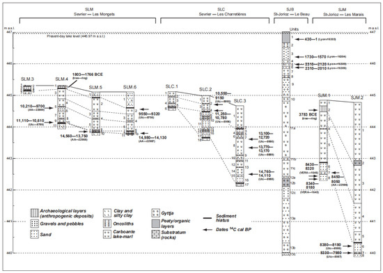On the western lake shore, sediment cores were taken from littoral mires at Saint-Jorioz Le Beau (SJB) and from the littoral platform at the archeological sites of Sevrier Les Charretières (SLC), Sevrier Les Mongets (SLM), and Saint-Jorioz Les Marais (SJM).