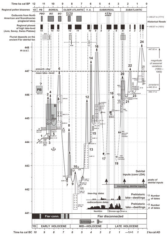 The litho-stratigraphical data were scarcer for the period of 5000–2700 cal BP. The altimetric positions of archeological layers at the Annecy-Le Pâquier and Angon sites (Late Neolithic) suggested a marked lake-level lowering during phase 17 (with the lake level at ca. 443.5 a.s.l., i.e., ca. 3.5 m below the present-day lake level). This estimate was close to the one estimated for phase 19 from the altitudinal position (i.e., ca. 443.38 m a.s.l., i.e., ca. 3.6 m below the present-day lake level) of wooden architectural structures (ground floor) observed at the Late Bronze Age site of Sevrier-Crêt de Chatillon. Between phases 17 and 19, the deposition of oncoliths in the archeological layer tree-ring dated to 1803–1766 BCE, i.e., 3753–3716 cal BP (Early Bronze Age), and overlain by a layer of carbonate lake marl contemporaneous with the Subboreal pollen biozone at the site of Sevrier Les Mongets [12,15] gave evidence of a rise in the lake level, which would have reached more than 446 m a.s.l., i.e., ca. 1 m below the present-day lake level (phase 18). Other wooden architectural structures observed at 444.5 m a.s.l. (i.e., ca. 2.5 m below the present-day lake level) at the Late Bronze Age sites of Sevrier-Crêt de Chatillon and Annecy-Petit Port 2 suggest a rise in the lake level beginning before 840 BCE (i.e., 2790 cal BP) during the transition between the Subboreal and Subatlantic pollen biozones.