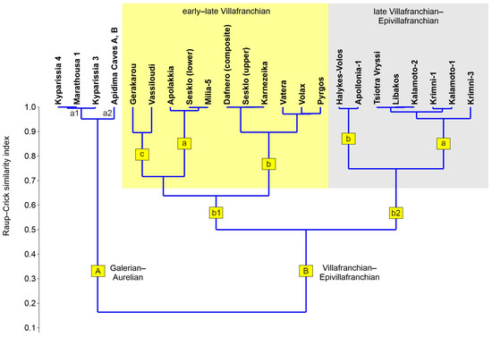 A hierarchical cluster analysis based on presence/absence data at the genus level was applied to a subset of the 23 most complete Greek LFAs (number of recorded genera ≥5) and 43 genera of large mammals (Supplementary Material) in order to test their best possible grouping(s) by means of faunal synthesis consistency and correlate clusters with particular time slices. The analysis was performed using PAST [28]. The Q-mode dendrogram [following UPGMA: unweighted pair group method with arithmetic mean algorithm] was obtained by applying several similarity indices, which provided consistent final groupings; the results of the Raup–Crick similarity index, which is used to statistically test presence/absence data through a randomization method [29], were selected for presentation. We excluded, however, a posteriori Aghia Kyriaki (AK; N genera = 6) as it stands as an outlier in most of the runs.