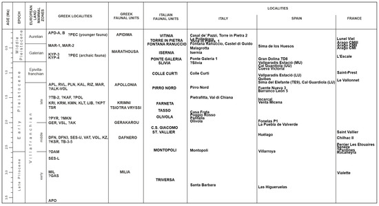 Correlation of the large mammal localities and faunal units of Greece with those of Italy, Spain, and France (data from [14,16,95,96]).