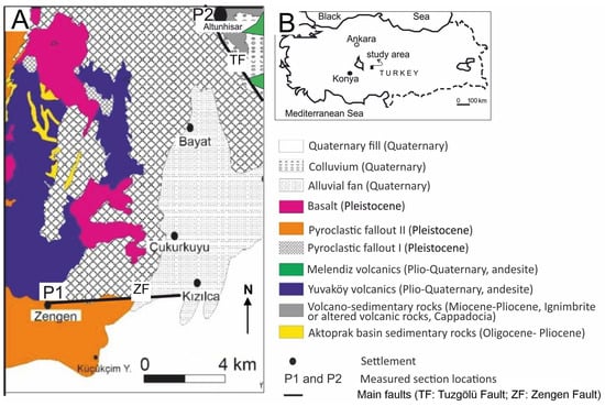 - Dönmez, M.; Türkecan, A.; Akçay, E.A. Kayseri-Niğde-Nevşehir Yöresi Tersiyer Volkanikleri Raporu; Maden Tetkik ve Arama Genel Müdürlüğü Rapor No: 10575; MTA: Ankara, Türkiye, 2003. [Google Scholar]