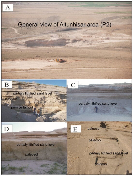 Images of the Altunhisar location (P2): (A) general view; (B) pumice fall-out deposit, partially lithified sand level, and paleosol; (C) partially lithified sand level; (D,E) partially lithified sand level and paleosols.