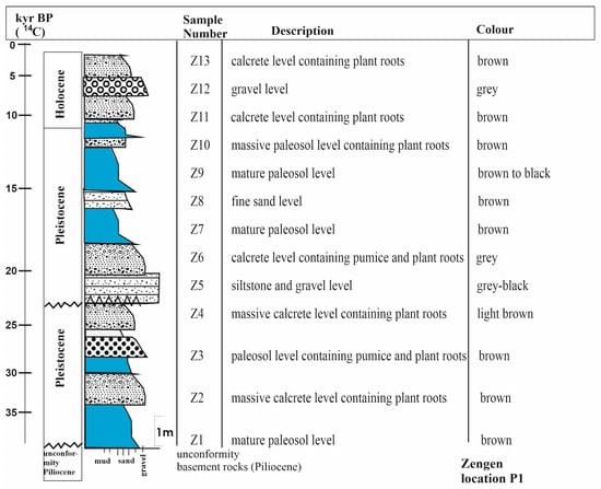 As seen in Figure 4, a lithostratigraphic vertical section has been drawn for the Ereğli–Zengen area, labelled as the P1 section. This region’s most essential and representative lithostratigraphic vertical section is found near the Zengen sand quarry and its immediate vicinity (Zengen, 37°48′44″ N; 34°13′45″ E; profile start at 1100 m; in ref. [30]). The levels consist primarily of red-colored, carbonate-rich sequences of mudstone-intercalated paleosol and calcrete as basement rocks in the area of the Pliocene (Figure 4, ZT1–ZT5). The profile starts with approximately 1 m thickness of brown mature paleosol (Z1). A 1 m thick massive calcrete containing brown plant roots (Z2) is overlying this level. This is covered by 1 m thick brown paleosol and contains plant roots and pumice gravels (Z3). Above this paleosol layer is approximately a 1 m thick light brown massive calcrete containing plant roots (Z4). Grey-to-black-colored partially lithified or semi-lithified sand and gravel levels extend horizontally (Z5). Above the sand–gravel levels is a 1 m thick grey calcrete containing plant roots (Z6). This calcrete level is overlaid by a brown mature paleosol level (Z7), followed by a thin brown sandy level (Z8). A dark brown to black mature paleosol level (Z9) is above the thin sandy level. A massive calcrete level containing plant roots is dark brown and occurs as a thinner level in the P1 profile (Z10). Above this level, a massive brown calcrete-containing plant roots exists (Z11). On top of the massive calcrete level (Z11), there is a grey gravel level (Z12). At the top of all this material is a brown massive calcrete level (Z13). Multiple hiatuses occur among units Z1 and Z13 (diastem and unit gap), and the latter unit is covered by modern soil. The grain size of the modern soil is predominantly mud and occasionally contains gravel fragments (basalt and andesite). Other grain-size components include fine sand, rich in humus and mainly containing grass and other plant roots.
