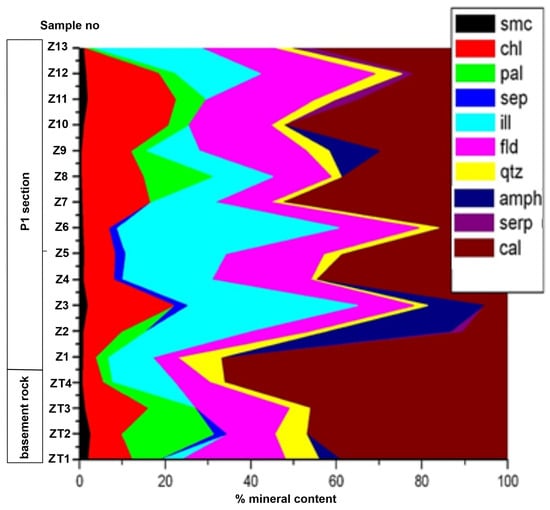 For the Z2 sample of the P1 profile, the minerals determined in the phases in the Jade program are quartz, calcite, and clay minerals. The clay minerals are illite, montmorillonite, and palygorskite, and for the Z3 sample, the minerals are quartz, calcite, hornblende, and clay minerals. The clay minerals are illite and chlorite. For the Z4 sample, the minerals are quartz, calcite, albite, and clay minerals. The clay minerals are illite, montmorillonite, chlorite. For the Z5 sample, the minerals are calcite, quartz, albite, and clay minerals. The clay minerals are montmorillonite, illite, and chlorite. For the Z6 sample, the minerals are calcite, quartz, albite, antigorite, and clay minerals. The clay minerals are montmorillonite, chlorite, and vermiculite (Figure 8). For the Z7 sample, the minerals are calcite, quartz, albite, and clay minerals. The clay minerals are illite, montmorillonite (smectite), chlorite, and vermiculite. For the Z8 sample, the minerals are calcite, quartz, albite, and clay minerals. The clay minerals are illite, palygorskite, montmorillonite (smectite), chlorite, and vermiculite. For the Z9 sample, the minerals are the same as for Z8. For the Z10 sample, the minerals are calcite, quartz, opal-CT, and clay minerals. The clay minerals are montmorillonite (smectite) and chlorite. For the Z11 sample, the minerals are calcite, quartz, albite, and clay minerals. The clay minerals are illite, chlorite, montmorillonite (smectite), and sepiolite. For the Z12 sample, the minerals are quartz, calcite, antigorite, and clay minerals. The clay minerals are illite, sepiolite, and chlorite. Mineral phases were initially identified from the XRD patterns, and the percentage quantities of the same minerals were determined using the SIROQUANT 3.0 software program (see also Figure 8).