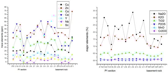 Distribution of the major elements such as NaO, K2O, TiO2, P2O5, MnO, and Cr2O3 (major elements) (right) and Ba, Ni, Sr, and Zr (trace elements) in samples from the Zengen region (left): ZT1–ZT5 (basement rock, Piliocene) and Z1–Z13 (P1 section, Quaternary).