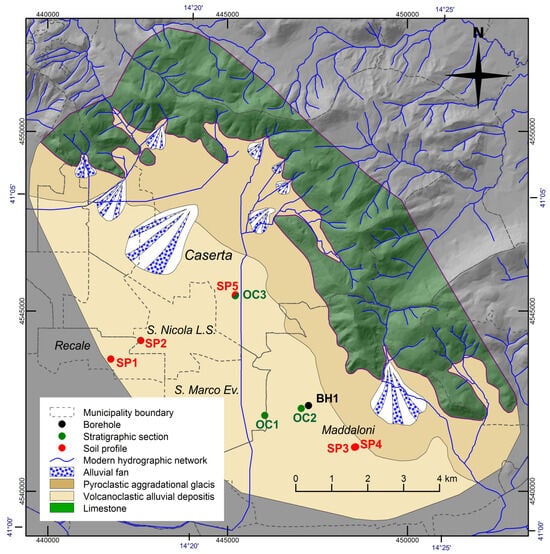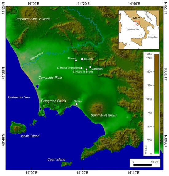 Such a geomorphological setting is offered by the large structural depression corresponding to the Campania Plain in Southern Italy (Figure 1 [14,15]). The Campania Plain evolved during the Quaternary as a large graben [16] in which thousands of meters of sediments and volcanic deposits accumulated due to fluvial and coastal processes along with volcanism [17,18,19,20,21,22,23,24]. To the North, East, and South, the Plain is rimmed by the Mesozoic carbonate Apennine nappes, while its western portion faces the Tyrrhenian Sea and hosts the Phlegrean Fields and Somma–Vesuvius volcanic districts. The latter, developed during the Late Pleistocene, produced important volcaniclastic deposits that interfingered with alluvial and transitional sediments, covering the Apennine ridges. Such a morpho-sedimentary evolution is particularly developed in the north-eastern sector of the Plain, facing the foothills, where pyroclastic deposition was associated with weathering processes that affected the carbonate slopes, favoring the formation of alluvial fans and colluvial deposits often enriched in detrital carbonate components [16,17,18,19,20,21,22,23,24,25].