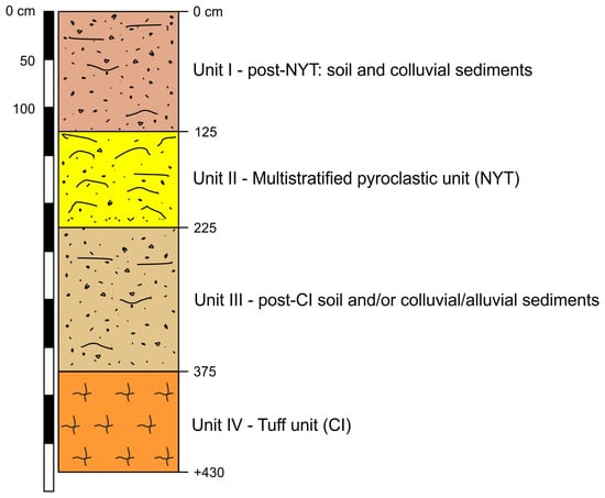 In all analyzed sections, the CI deposit was separated from the upper NYT by a thick depositional unit, which varies in thickness from 100 to 200 cm (Unit III). In the OC1 section, it consists of a brown paleosol; in the OC2 and OC3 sections, the paleosol is also accompanied or substituted by a level of colluvial and/or alluvial sediments. In particular, in the OC3 section, these latter were described as a pedogenized level, which consisted of discontinuous deposits of altered pumices in the pyroclastic matrix, where the characteristics of these reworked pumices suggested the participation of CI products in the formation of the level in question [16]. The effects of sediment mobilization post-CI were also recorded in the BH1 borehole in which the deepest horizons, although apparently linked to the underlying CI substratum, were separated from this latter by an erosional surface [18].