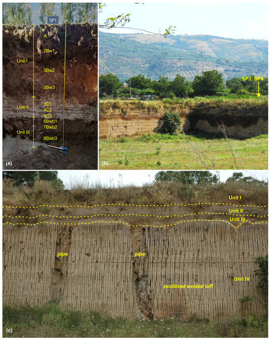 In all soil profiles (on Unit IV where present) a first pedogenized portion (Unit III) occurred (Figure 5a,c). The soil profiles that better exhibited Unit III (SP1, SP3, SP4, and SP5) consisted of buried soil horizons (Ab, Bwb, and CB), with a total thickness varying from 70 to 120 cm. Variable proportions of volcanic lithics and pumices, with some loose, fragmented crystals, constituted the rock fragment fraction of these buried soil horizons. Mainly sandy loam textures and clear or abrupt horizon boundaries were mainly found. In a position like that occupied in the soils by the buried horizons, a paleosol level is recognized on the land surface extending from the Phlegrean Fields to the Campania Plain [39,40], as well as in the reported lithostratigraphies. In some of them, it also occurred above a colluvial layer [16,25,38].