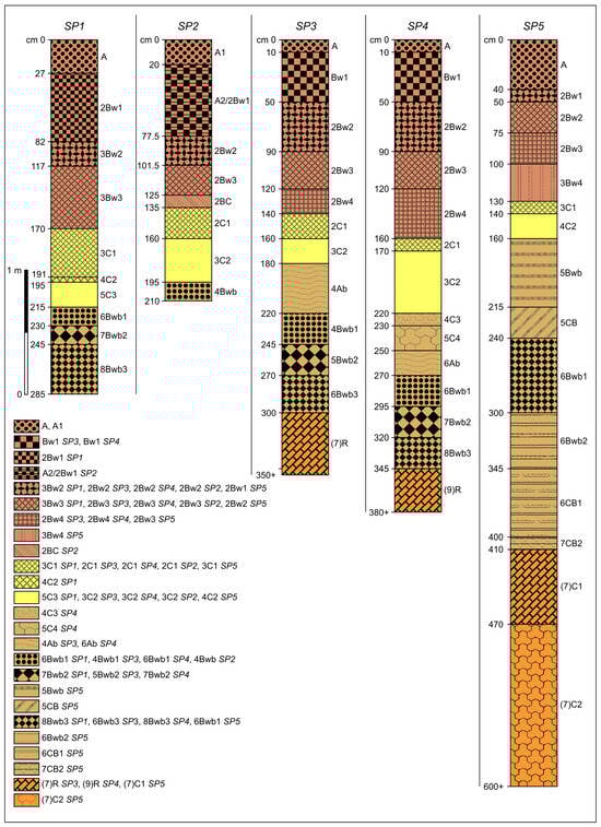 Genetic correspondence among the studied soil profiles. The same drawing depicting the horizons of different soil profiles serves to tentatively correlate the horizons in question in terms of function of their origin and position in pedostratigraphy. The horizons designed by the change of the Arabic number preceding the capital letter of the soil horizon with respect to the number of the underlying horizon have sedimentary origin; the horizons not designed by this change have residual origin (see text for further details).