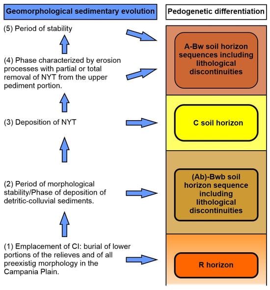 Overall, however, the results obtained by the pedological investigation were consistent with the reported lithostratigraphic investigations conducted in the study area, which suggested that sediments deriving from runoff and dissection activities post-CI and NYT deposition contributed to the formation of buried and modern soils, as described in the lithostratigraphic sequences. The interpretation of these lithostratigraphic sequences in the pedological key showed the close correspondence between geomorphic–sedimentary events and pedostratigraphic characteristics, as depicted in Figure 7. In particular, the susceptibility of the slopes bordering the Campania Plain to loss and transfer of loose materials, also probably under favorable climatic events [17], contributed to generating colluvial, dendritic, and erosion phases that have been redistributed on surfaces morphologically suitable not only to receive but also to retain sediments: these participated effectively in the construction of the pedological covers, interrupting the “normal top down” pedogenesis from the primary volcanic deposits through the burial of the primary deposits or their pedogenetic products. In the described soil architecture, the identification of “exogenous soil materials” and their differentiation from the “endogenous” ones, as well as their contribution to the comprehension of the surface dynamic construction, provide information on characteristics and properties that can abruptly vary and contrast along the soil profile. This is particularly relevant in the relationship between soil and water. Water, in addition to its primary role as a vector of most of the weathering processes of the mineral components and decomposition of the organic matter, is directly connected to the hydraulic soil properties. The study of the latter, which is one of the main concerns in the rainfall-induced landslide assessment, is a particularly complex task when applied to vertically heterogeneous soils: in these cases, where discontinuities are found to contribute to the infiltration process [60], the investigation of contrasting hydraulic properties [61,62,63,64,65,66] can highly benefit from the pedological approach.