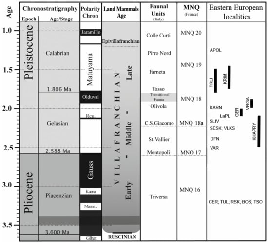 Correlation of the Villafranchian biochronology between Eastern and Western Europe (geological age and biochronological position of selected Eastern European Villafranchian localities). The biochronology table and the correlation between the faunal units and the MNQ zones is based on Nomade et al. [] with some original modifications. The additional column on the far right presents the position of the Eastern European localities, discussed in Section 2.3. Abbreviations of polarity subchrons: Reu.—Réunion; Mamm.—Mammoth. Localities abbreviations: CER—Cernãteşti; TUL—Tulucesti; RSK—Ripa Skortselskaya; BOS—Bossilkovtsi; TSO—Tsotylio; DFN—Dafnero; SESK—Sesklo; VAR – Varshets; VLKS—Volakas; SLIV—Slivnitsa; LaPI—La Pietris; GER—Gerakarou; KARN—Karnezeika; VGRA—Vale Graunceanului; KRIM—Krimni; TRLI—Trlica; APOL—Apollonia.