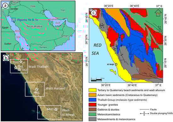 (a) Location map of the study area in north-western Saudi Arabia; (b) Sample locations in three investigated wadis shown on a Google-based satellite image; (c) Modified geological map of Al Wajh quadrangle based on lithological boundaries from [] and updated nomenclature from [].