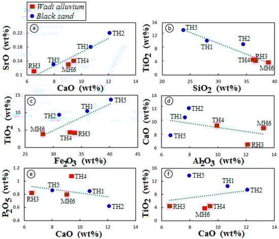 Figure 3a shows that the best proportional relationship exists between CaO and SrO (R2 = 0.8973). In the investigated heavy concentrates, both elements are encountered in the structure of non-opaques, mostly Ca-bearing amphibole. In nature, as well as experimentally, Ca2+ can be replaced totally in the M2- and M4-sites by Sr2+ []. On the other hand, a good regression trend (R2 = 0.8856) is obtained from a reverse relationship between SiO2 and TiO2 (Figure 3b). Normally, TiO2 decreases when Ti-bearing opaque minerals are minimal while primary silicate minerals dominate. Some secondary silicate, e.g., titanite replacing Ti-magnetite and ilmenite, can bear some Ti4+ as well. The relationship between Fe2O3t and TiO2 is proportional (R2 = 0.5743) (Figure 3c). In fact, this is common in stream sediments that are characterized by magnetite- and ilmenite-rich concentrates, which is the case of the investigated black sand. In northwestern Saudi Arabia, iron and titanium are positively correlated either in Fe-Ti-P ore or its host gabbros []. Contents of Al2O3 vs. CaO, CaO vs. P2O5 and CaO vs. TiO2 are poorly correlated (Figure 3d–f) with low regressions (0.1807, 0.1442 and 0.0658, respectively). The relationship between CaO and P2O5 suggests a minimal influence of accessory apatite, which is neither seen microscopically nor by EDX microanalysis. Although the relationship between CaO and TiO2 is weak, it is an indicator of the alteration degree of Ti-bearing opaque minerals into titanite [,].