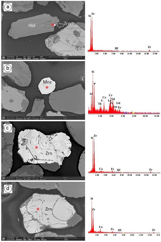 BSE images and spectral analyses of non-opaque accessory minerals from the wadi alluvium. (a) Extremely fine zircon (Zrn) at the peripheral zone of coarse hornblende (Hbl), fine fraction, Wadi Thalbah; (b) Subhedral U- and Th-bearing monazite (Mnz), fine fraction, Wadi Thalbah; (c) Anhedral zoned zircon (Zrn), fine fraction Wadi Al Miyah; (d) Fractured anhedral zircon (Zrn), coarse fraction, Wadi Al Miyah. A red Astrix is added to indicate exact position of analysis.