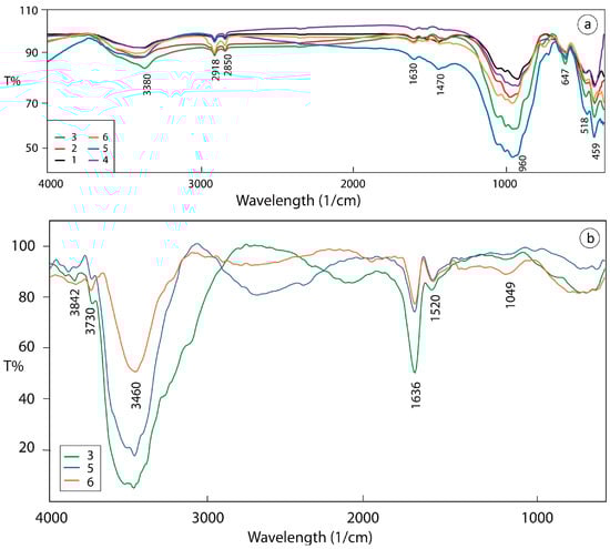 FTIR spectra of the heavy concentrates. (a) Bulk/whole-fraction (magnetic and non-magnetic); (b) Three representative magnetic fractions. (1) Fine black sand, Wadi Thalbah, (2) Coarse black sand, Wadi Thalbah, (3) Fine wadi alluvium, Wadi Al Miyah, (4) Fine wadi alluvium, Wadi Thalbah, (5) Coarse black sand, Wadi Thalbah, and (6) Coarse wadi alluvium, Wadi Haramil.