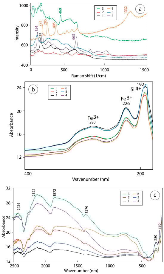 Raman and UV spectra of the whole-fraction heavy concentrates. (a) Raman spectra; (b) UV spectra up to 400 nm; (c) UV spectra up to 2500 nm. (1) Fine black sand, Wadi Thalbah, (2) Coarse black sand, Wadi Thalbah, (3) Fine wadi alluvium, Wadi Al Miyah, (4) Fine wadi alluvium, Wadi Thalbah, (5) Coarse black sand, Wadi Thalbah, and (6) Coarse wadi alluvium, Wadi Haramil.