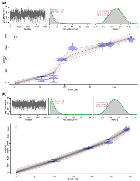 Organic-rich samples were selected for AMS 14C dating at various depths for both GL and B core. The radiocarbon dates were calibrated using INTCAL 20 [33]. These calibrated dates were then applied to develop the age–depth model. The rbacon package v.3.2.0 [34] was utilized to construct this model, and Bayesian statistical methods were employed sediment accumulation rates through time.