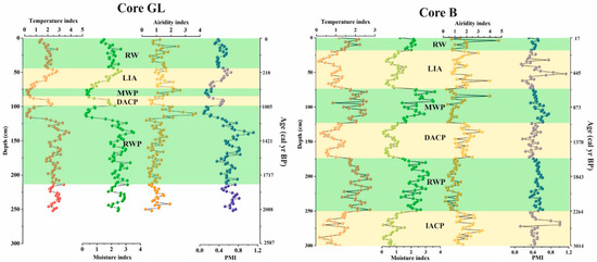 The semi-quantitative aridity index of [46] was calculated by dividing the sum of Chenopodiaceae plus Artemisia pollen by the percentage of Poaceae pollen. Temperature and moisture were also estimated semi-quantitatively based on the ratios between groups of pollen taxa, which represented different temperature and moisture conditions [47,48,49].
