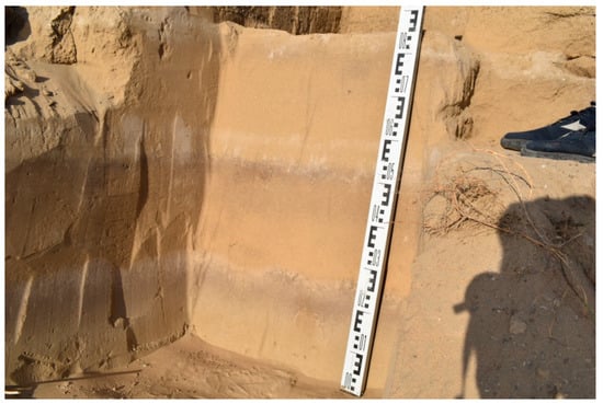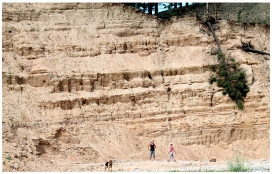 The Zaigrayevsky reference section (Figure 3) is situated in a quarry on the northeastern outskirts of the Zaigrayevo settlement. Its main part is confined to the fourth terrace of the Bryanka River. The terrace is composed of horizontally laid light-grey multigrained alluvial sands with gravel lenses, which alternate with layers of aeolian, aeolian-deluvial and deluvial sands. Four horizons of aeolian sands were identified, their thickness varying from 0.2 m to 4.1 m, which indicates frequent changes in facies conditions during formation of the exposed strata. In the upper part of the section, represented by modern aeolian deposits, two horizons of buried soils were revealed, and, in the central part, a bone of a woolly rhinoceros was found [22]. According to the results of earlier studies, woolly rhinoceroses inhabited almost the entire territory of northern Eurasia in the Late Pleistocene [23,24]. Thus, this species is an important biostratigraphic indicator of the Late Pleistocene.