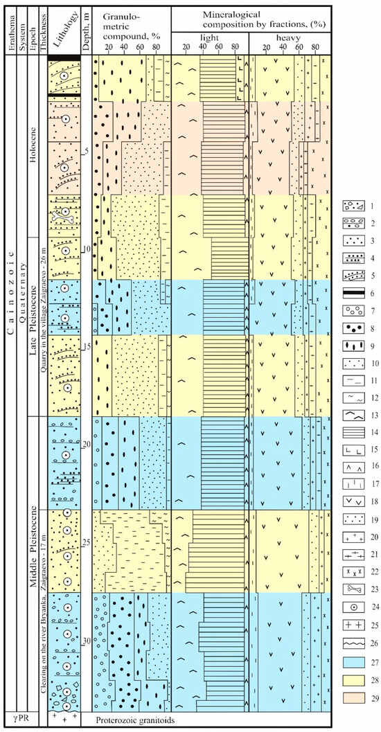 Granulometric analysis of the sands of the Zaigrayevsky section showed that their size changes from the bottom to top of the section, becoming finer grained, and the gravel class of grains disappears altogether (Figure 4). Alluvial gravel and sand-gravel deposits are well-washed and -sorted and are confined to the bottom part of the section. The sands from the middle part of the section and its top are dominated by medium-grained (0.5–0.25 mm) sand grains.