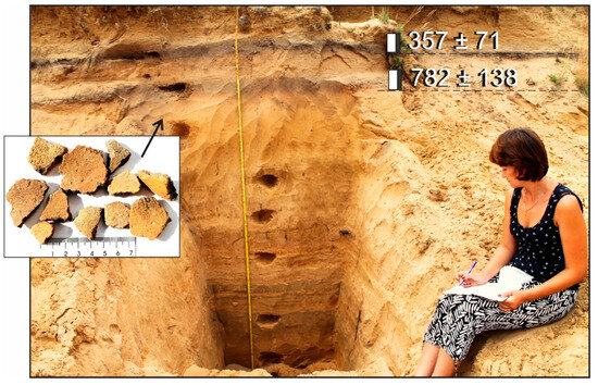 Pit at the Ilkinsky reference section. Two soil horizons and numerous pottery fragments buried beneath aeolian sands (pottery is shown in the photo insert, and the arrow shows sands containing pottery); numbers show the calendar age of soil horizons; GPS: N 51°41′58.7″; E 108°37′26.4″.
