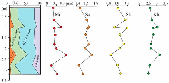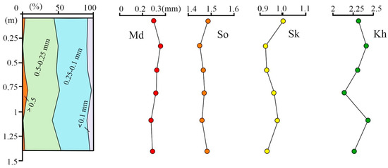The genetic features of the granulometric composition of sand sediments were revealed by analyzing distribution histograms, accumulation curves and calculated statistical parameters (modal and median particle diameters, sorting coefficients, asymmetry and heterogeneity) [25,26].