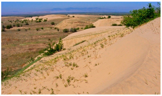 In the last decade, the studies of modern aeolian processes and the material composition of sediments, vegetation and landscapes in areas of blown sands have been devoted to the works [9,10,11,12,13,14,15]. Information on the distribution of areas of loose sands in the Holocene and the stages of deflation and accumulation is contained in the publications [15,16,17,18,19].