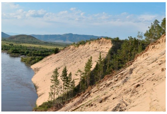 It is known that aeolian sands in southern northern Asia are confined mainly to river valleys, hilly plains and intermountain hollows [4,5,6,7]. The territory of Selenga Dauria covers not only Western Transbaikalia but also extends beyond Russia into Mongolia, to the places where the Selenga River originates (Figure 2). An extreme continental semi-arid climate with cold winters and relatively warm summers prevails here. The river valleys and intermountain hollows contain thick (over 30 m) deposits of aeolian strata. Sands largely shape local landscapes represented by pine forests, forest steppes, steppes, semi-deserts and small deserts such as Aman-Khan and Chara. The current progressive desertification of the region significantly aggravates socio-economic and environmental problems. The number of livestock pastures and plowlands is gradually decreasing.
