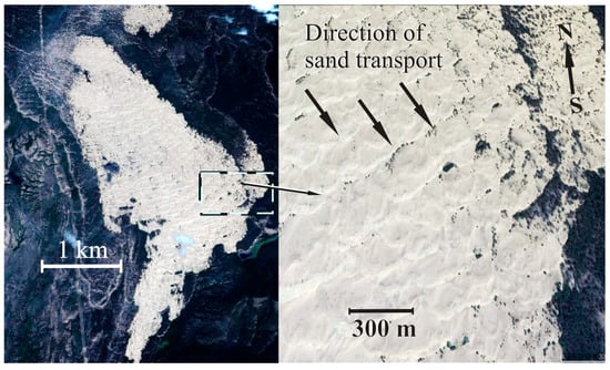 The Aman-Khan sand desert extends in a submeridional direction 40 km northeast of Kyakhta (Figure 11). The area of sands occupied by the desert is about 15 km2, with a length of more than five kilometers. Some researchers refer to it as the Big Sands natural boundary or the Malkhan-Elysu desert [6,9]. Satellite images show that this is a small sand desert, which is formed not by chaotic piling of parabolic dunes but by their regular succession in the form of transverse sand chains or sand ramparts extending perpendicular to the prevailing wind direction (Figure 12). This is the result of a multi-year cyclic movement of aeolian sands based on rhythmic, predominantly interseasonal, aeolian transportation. It should be noted that parabolic dunes in the marginal parts of the cross-sand ramparts smoothly grade to dome-shaped and vegetated dunes. The base width of some parabolic dunes reaches 160 m, and the length of their symmetry axis is about 80 m.